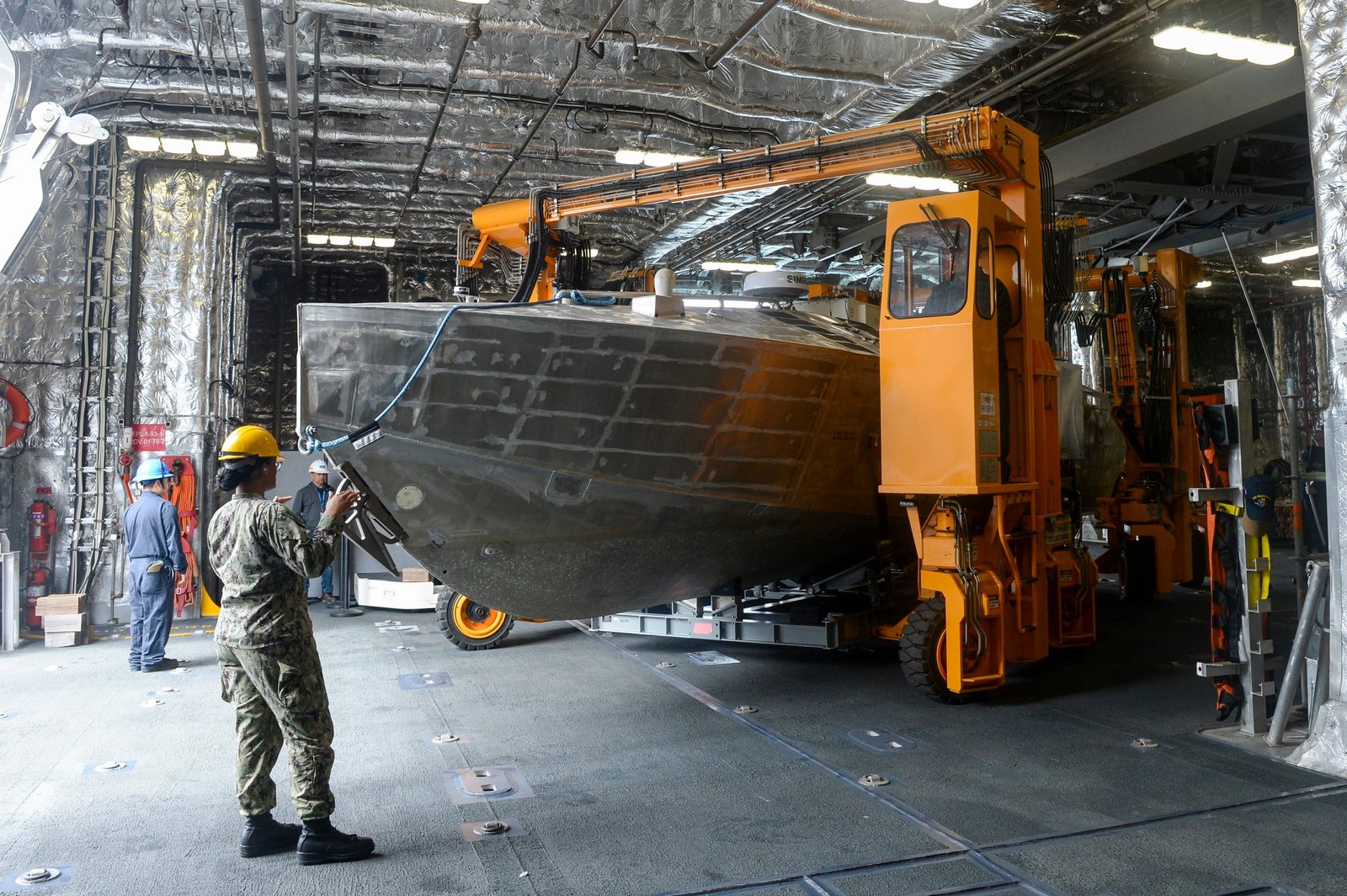 Sailors aboard the USS Canberra transport an unmanned surface vehicle in the ship’s mission bay, as part of the first embarkation of the MCM mission package, April 23, 2024. (MC1 Vance Hand/U.S. Navy)